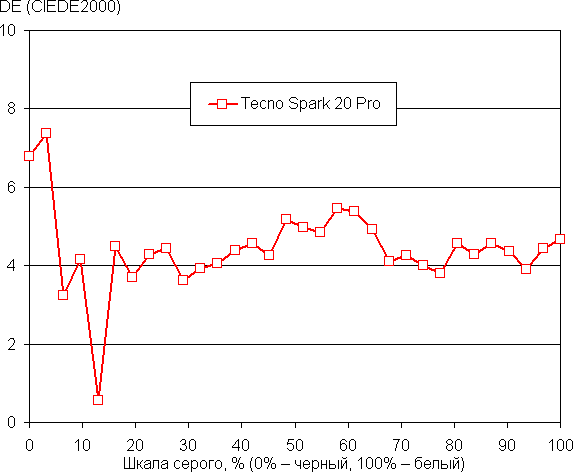 В принципе, яркий свет может приводить к нарушению суточного (циркадного) ритма (см. статью про iPad Pro с дисплеем 9,7 дюйма), но все решается снижением яркости до низкого, но еще комфортного уровня, а искажать цветовой баланс, уменьшая вклад синего, нет абсолютно никакого смысла. Эту настройку можно использовать для коррекции цветового баланса. Результат после ручной коррекции (ползунок как на снимке выше) хороший, так как цветовая температура становится достаточно близкой к стандартным 6500 К, а отклонение от спектра абсолютно черного тела (ΔE) остается ниже 10, что для потребительского устройства считается приемлемым показателем. При этом цветовая температура и ΔE мало изменяются от оттенка к оттенку — это положительно сказывается на визуальной оценке цветового баланса. (Самые темные области шкалы серого можно не учитывать, так как там баланс цветов не имеет большого значения, да и погрешность измерений цветовых характеристик на низкой яркости большая.)