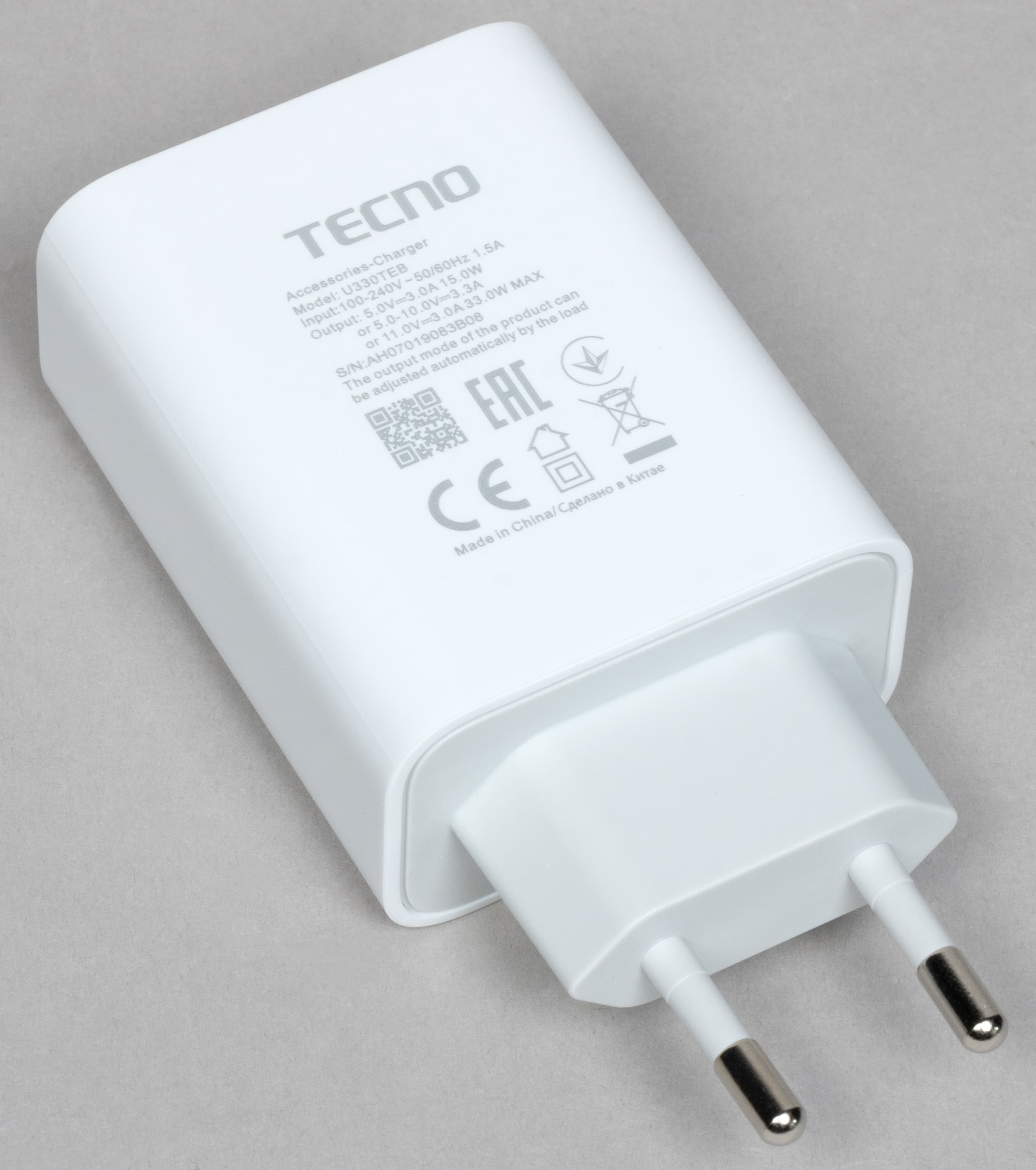 В упаковке есть зарядное устройство с максимальной выходной мощностью 33 Вт, соединительный кабель и защитный чехол.