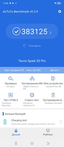 Tecno Spark 20 Pro имеет батарею с типичным на сегодняшний день объемом в 5000 мА·ч. Автономность смартфон демонстрирует немного ниже средней — видимо, сказываются большой экран с высоким разрешением и платформа, не славящаяся экономным энергопотреблением.