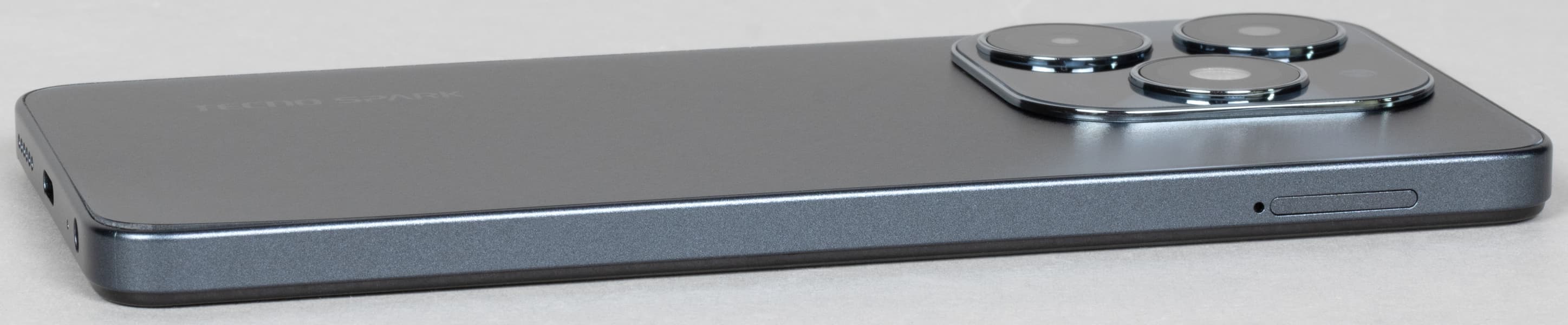 Tecno Spark 20 выглядит стильно и современно. Актуальный дизайн корпуса с широкими плоскими боковинами и плоскими же фронтальной и тыльной поверхностями не подразумевает зауженностей на боках и загнутых стекол. Смартфон не столь изящен, как аппараты со скругленными боками, но зато надежно удерживается в ладони.