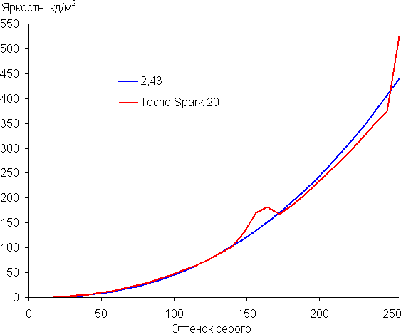 Построенная по 32 точкам с равным интервалом по численному значению оттенка серого гамма-кривая не выявила завала ни в светах, ни в тенях. Показатель аппроксимирующей степенной функции равен 2,43, что выше стандартного значения 2,2. При этом реальная гамма-кривая существенно отклоняется от степенной зависимости: