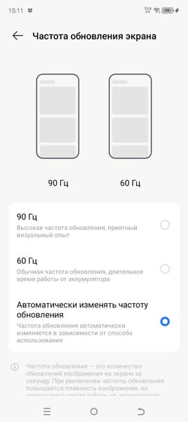 В настройках экрана можно включить режим с повышенной до 90 Гц частотой обновления, что приводит как минимум к увеличению плавности прокрутки списков в меню.