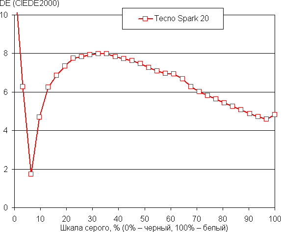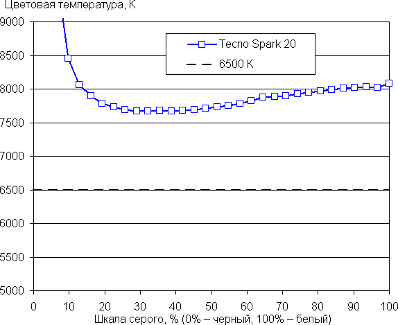 В принципе, яркий свет может приводить к нарушению суточного (циркадного) ритма (см. статью про iPad Pro с дисплеем 9,7 дюйма), но все решается снижением яркости до низкого, но еще комфортного уровня, а искажать цветовой баланс, уменьшая вклад синего, нет абсолютно никакого смысла. Эту настройку бесполезно использовать для коррекции цветового баланса, так как даже на минимальной коррекции цветовая температура ниже стандартных 6500 К (а именно 6200 К). Лучше оставить все по-умолчанию, так как при этом обеспечивается максимальная яркость. Да, цветовая температура высоковата, но хотя бы отклонение от спектра абсолютно черного тела (ΔE) остается ниже 10, что для потребительского устройства считается приемлемым показателем. При этом цветовая температура и ΔE мало изменяются от оттенка к оттенку — это положительно сказывается на визуальной оценке цветового баланса. (Самые темные области шкалы серого можно не учитывать, так как там баланс цветов не имеет большого значения, да и погрешность измерений цветовых характеристик на низкой яркости большая.)