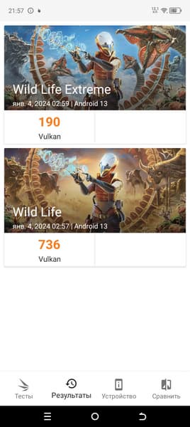 | 3DMark Wild Life Vulkan (больше — лучше) | 736 | 4505 | 4186 | 2450 | 1327 |
