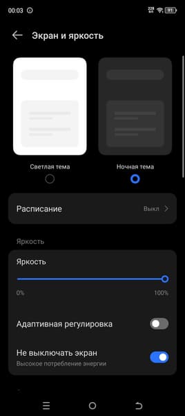 При ручном управлении яркостью и при выводе белого поля во весь экран максимальное значение яркости составило 530 кд/м². Максимальная яркость очень высокая (хотя есть момент, о котором ниже), и, учитывая отличные антибликовые свойства, смартфоном как-то можно будет пользоваться даже в солнечный день вне помещения. Минимальное значение яркости — 5 кд/м², поэтому в полной темноте яркость можно понизить до комфортного значения. В наличии автоматическая регулировка яркости по датчику освещенности (он находится на фронтальной панели близко к ее верхнему краю правее решетки фронтального громкоговорителя). В автоматическом режиме при изменении внешних условий освещенности яркость экрана как повышается, так и понижается. Работа этой функции зависит от положения ползунка регулировки яркости: им пользователь может попытаться выставить желаемый уровень яркости в текущих условиях. Если оставить все по умолчанию, то в полной темноте функция автояркости уменьшает яркость до 5 кд/м² (темновато), в условиях освещенного искусственным светом офиса (примерно 550 лк) устанавливает на 190 кд/м² (нормально), а условно под прямыми лучами солнца повышает до 500 кд/м² (немного ниже максимума). Результат по умолчанию нас не удовлетворил, поэтому мы попробовали повысить яркость в полной темноте. Яркость стала выше, но после цикла повышения внешней освещенности и ее снижения, все вернулось к тем же значениям, что были до вмешательства. Получается, что функция автоподстройки яркости работает более-менее адекватно, но не позволяет пользователю настраивать свою работу под индивидуальные требования. На любом уровне яркости значимая модуляция подсветки отсутствует, поэтому нет и никакого мерцания экрана.