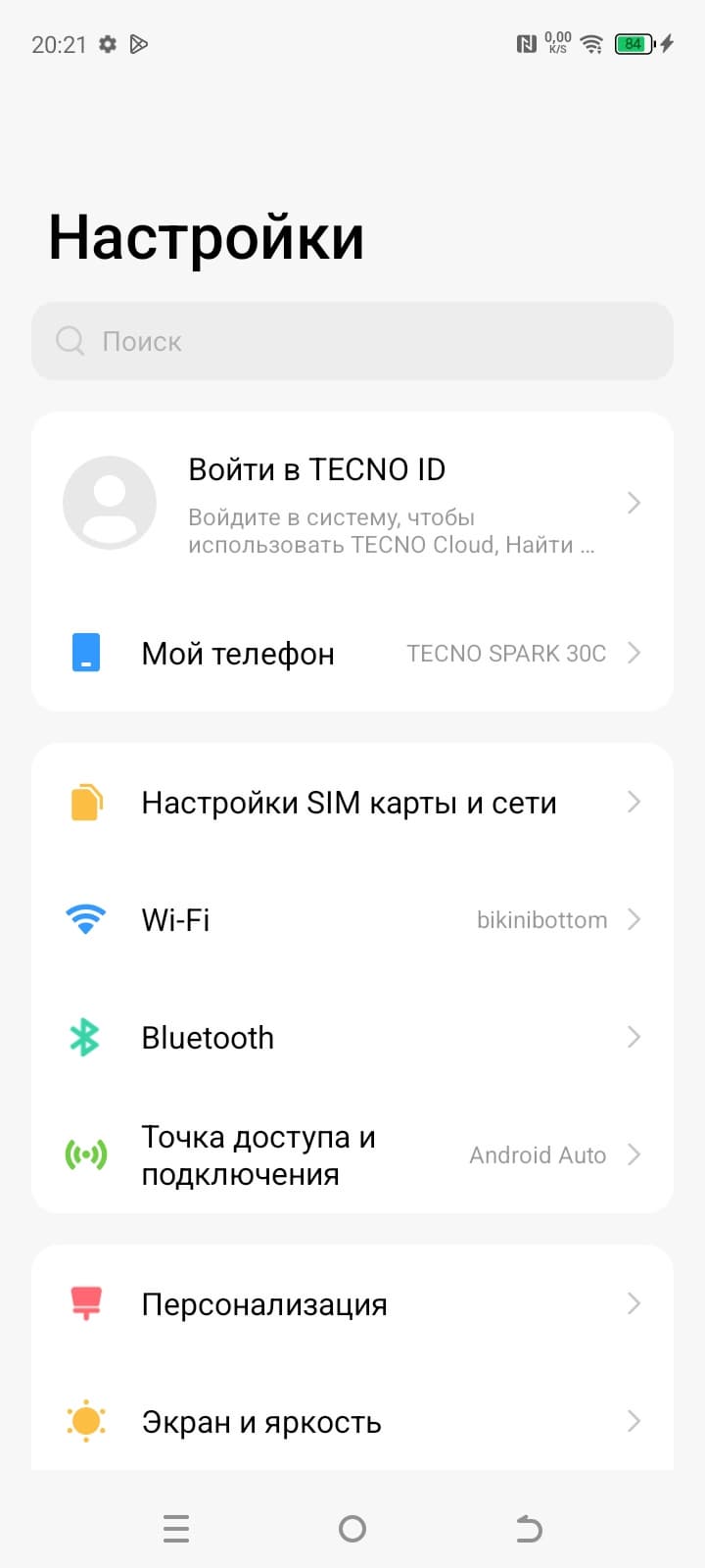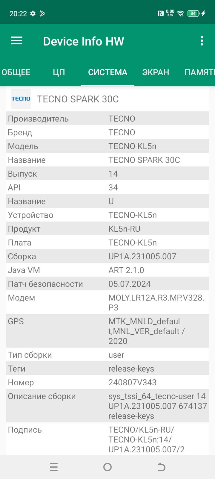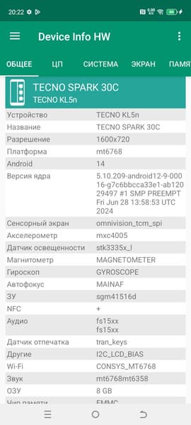Tecno Spark 30C поддерживает мобильные сети вплоть до 4G, два диапазона Wi-Fi 5 и Bluetooth 5.0, есть поддержка NFC. Поддержки e-SIM нет. На практике в пределах городской черты московского региона аппарат демонстрирует уверенную работу в беспроводных сетях, не теряет связь, быстро восстанавливает связь после вынужденного обрыва. Все необходимые встроенные датчики на месте. Приятно, что не сэкономили даже на гироскопе.