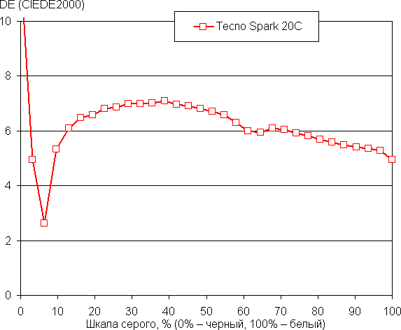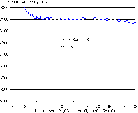Баланс оттенков на шкале серого компромиссный, так как цветовая температура существенно выше стандартных 6500 К, но хотя бы отклонение от спектра абсолютно черного тела (ΔE) остается ниже 10, что для потребительского устройства считается приемлемым показателем. При этом цветовая температура и ΔE мало изменяются от оттенка к оттенку — это положительно сказывается на визуальной оценке цветового баланса. (Самые темные области шкалы серого можно не учитывать, так как там баланс цветов не имеет большого значения, да и погрешность измерений цветовых характеристик на низкой яркости большая.)