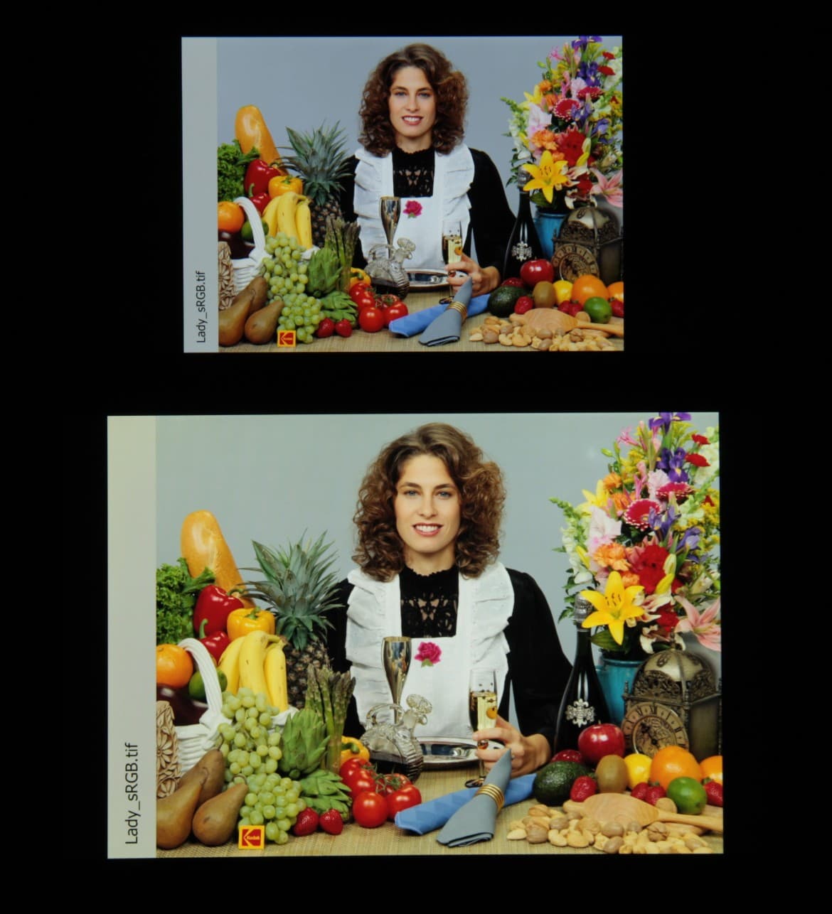 Для сравнения приведем фотографии, на которых на экраны смартфона (он выше) и второго участника (Nexus 7 — ниже) выведены одинаковые изображения, при этом яркость экранов изначально установлена примерно на 200 кд/м², а цветовой баланс на фотоаппарате принудительно переключен на 6500 К: