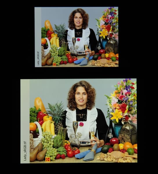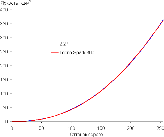 Построенная по 32 точкам с равным интервалом по численному значению оттенка серого гамма-кривая не выявила завала ни в светах, ни в тенях. Показатель аппроксимирующей степенной функции равен 2,27, что немного выше стандартного значения 2,2. При этом реальная гамма-кривая мало отклоняется от степенной зависимости: