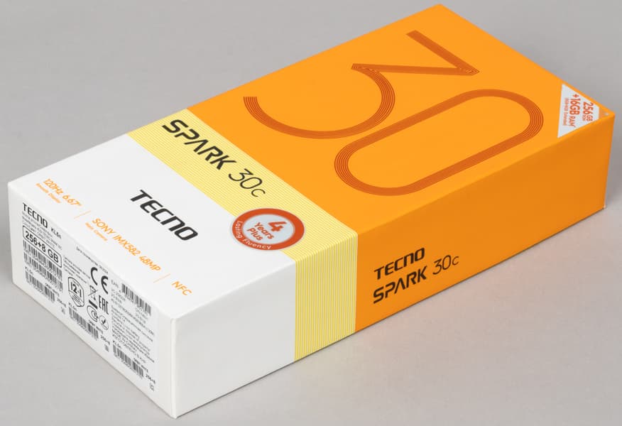 Смартфон Tecno Spark 30C поставляется в картонной коробке с простым ярким оформлением.