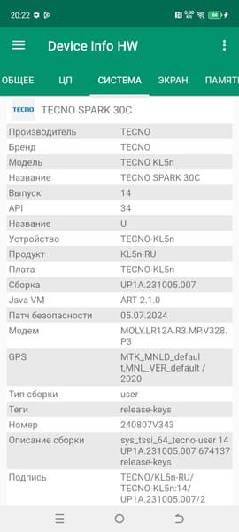 Основные характеристики Tecno Spark 30C (модель KL5n)