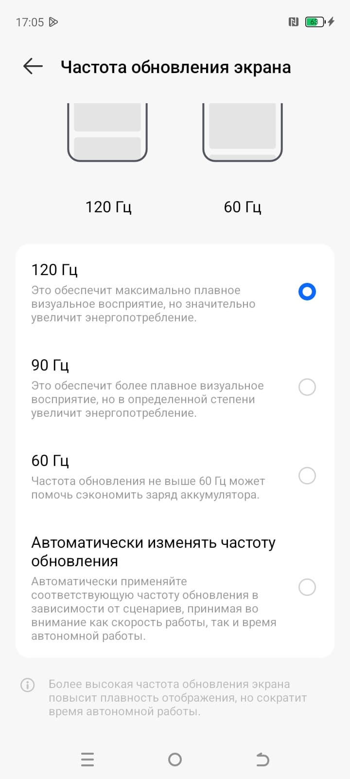 В настройках экрана можно включить режим с повышенной до 90 или 120 Гц частотой обновления, что приводит как минимум к увеличению плавности прокрутки списков в меню.