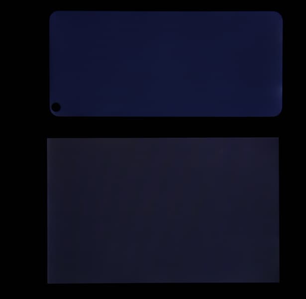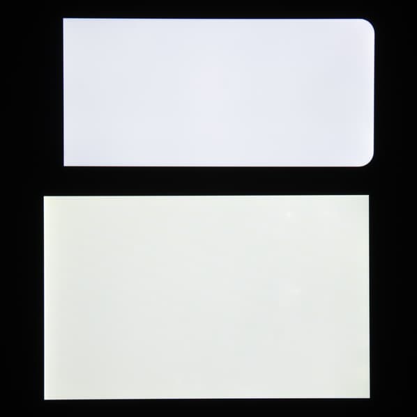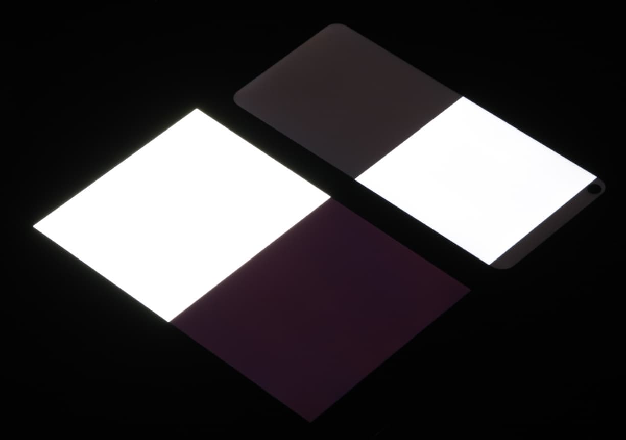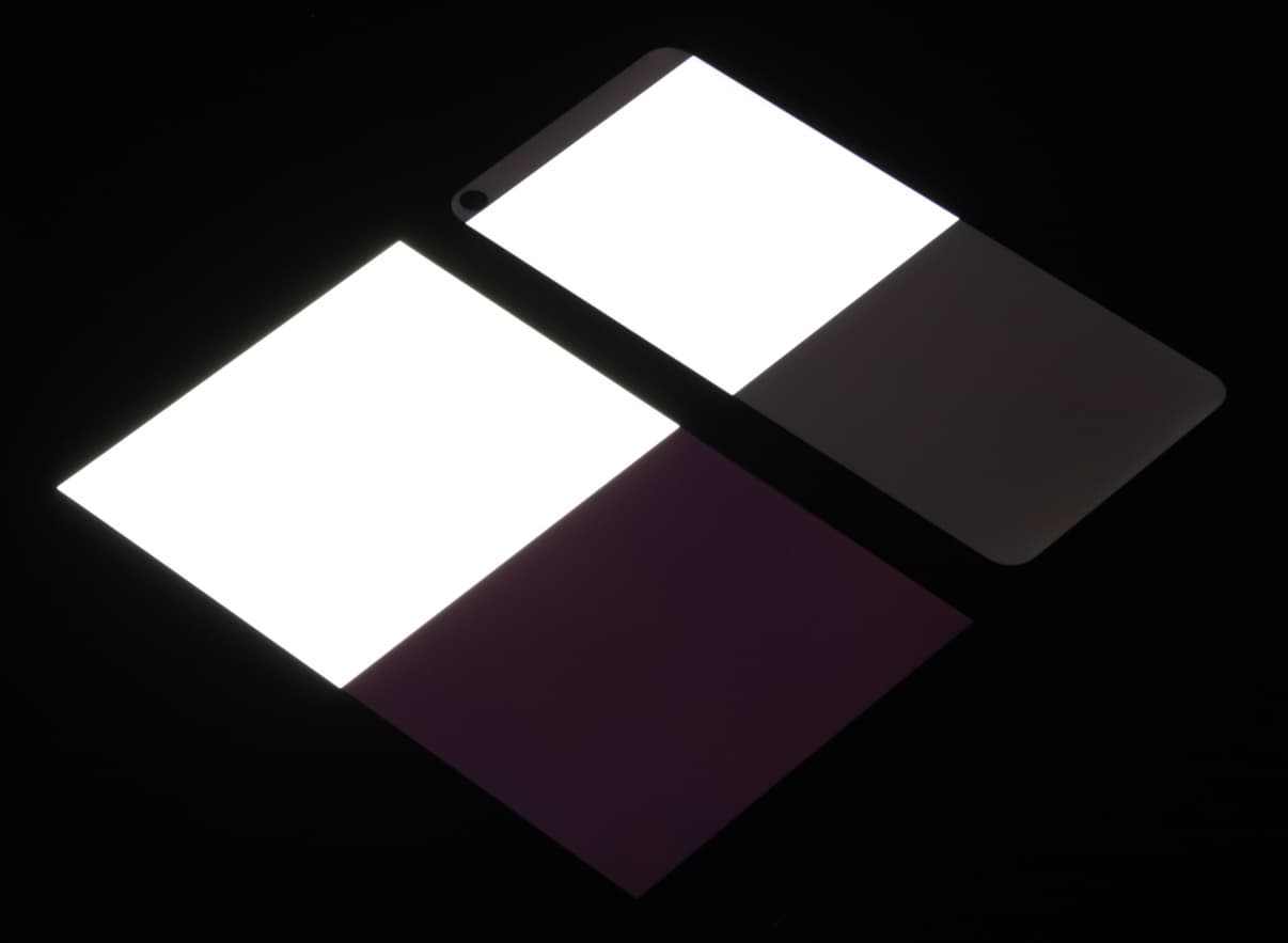Яркость под углом у экранов уменьшилась (как минимум в 5 раз, исходя из разницы в выдержке), но в случае Tecno Spark 5 яркость снизилась заметно больше. Черное поле при отклонении по диагонали сильно высветляется (особенно относительно яркости белого поля под тем же углом), но остается условно нейтрально-серым (так видно глазом). Фотографии ниже это демонстрируют (яркость белых участков в перпендикулярном плоскости экранов направлении одинаковая!):