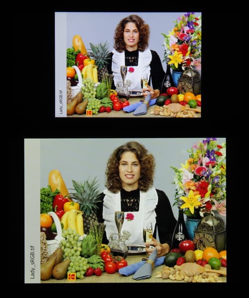 Баланс оттенков на шкале компромиссный, так как цветовая температура существенно выше стандартных 6500 К, но отклонение от спектра абсолютно черного тела (ΔE) ниже 2, что для потребительского устройства считается отличным показателем. При этом цветовая температура и ΔE мало изменяются от оттенка к оттенку — это положительно сказывается на визуальной оценке цветового баланса. (Самые темные области шкалы серого можно не учитывать, так как там баланс цветов не имеет большого значения, да и погрешность измерений цветовых характеристик на низкой яркости большая.)