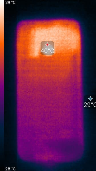 Нагрев выше в верхней части аппарата, что, видимо, соответствует расположению микросхемы SoC. По данным теплокамеры, максимальный нагрев составил 40 градусов (при температуре окружающего воздуха в 24 градуса), это средний нагрев в данном тесте для современных смартфонов.