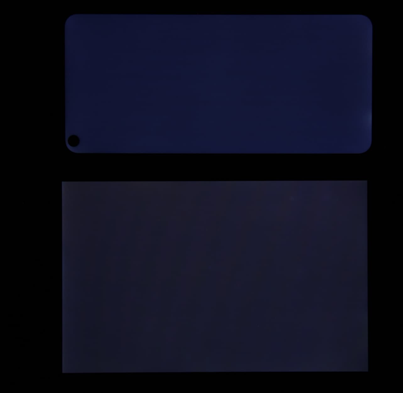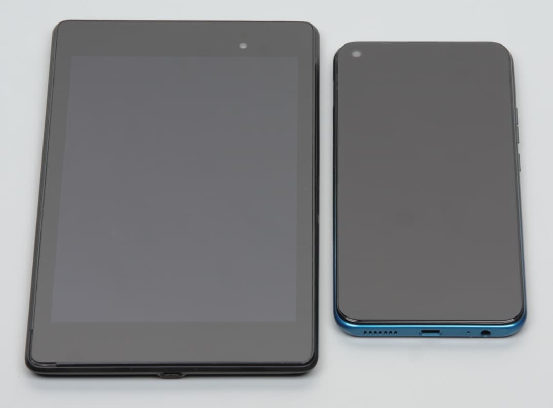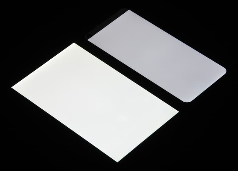 Лицевая поверхность экрана выполнена в виде стеклянной пластины с зеркально-гладкой поверхностью, устойчивой к появлению царапин. Судя по отражению объектов, антибликовые свойства экрана лучше, чем у экрана Google Nexus 7 (2013) (далее просто Nexus 7). Для наглядности приведем фотографию, на которой в выключенных экранах отражается белая поверхность (слева — Nexus 7, справа — Tecno Spark 5, далее их можно различать по размеру):