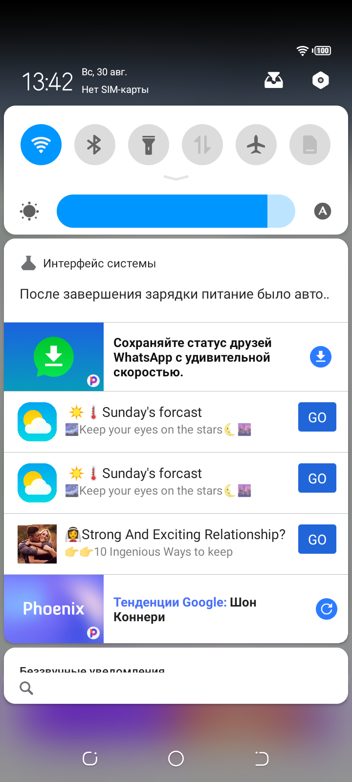 Омрачает впечатление лишь обилие всплывающей рекламы и рекомендаций, в том числе от фирменного браузера Phoenix, выдающего оповещения в панели уведомлений и в новостном окне справа.