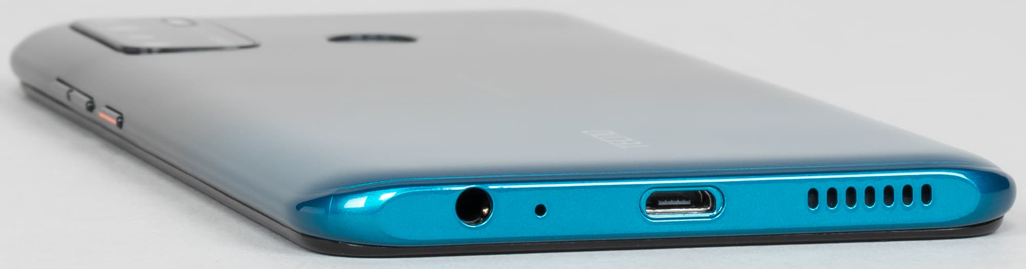 На верхнем торце ничего нет. В нижнем торце установлены динамик, разговорный микрофон, разъем Micro-USB и 3,5-миллиметровый выход для наушников.