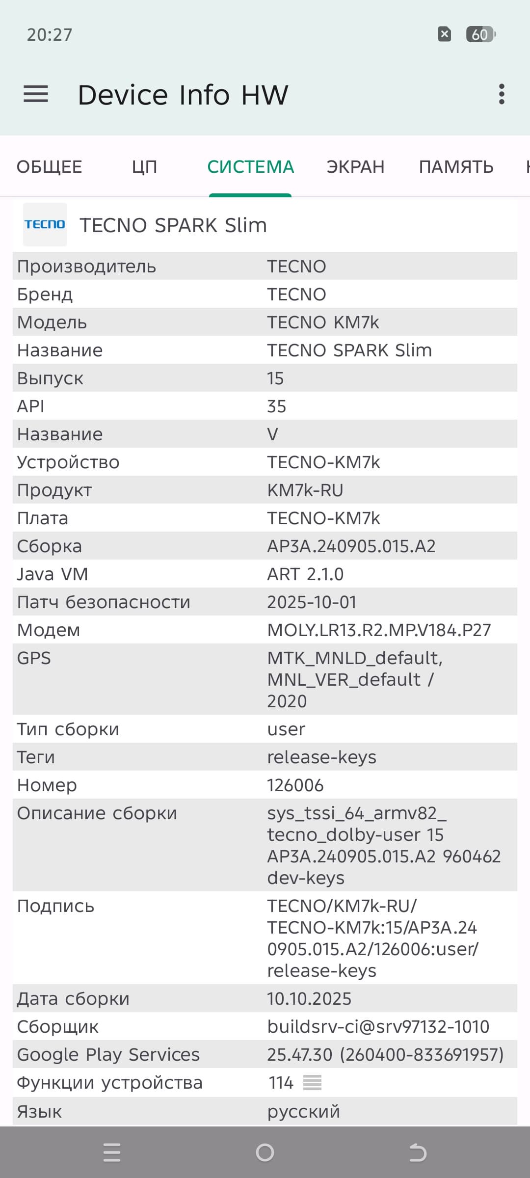 Основные характеристики Tecno Spark Slim (модель KM7k)