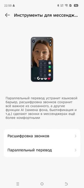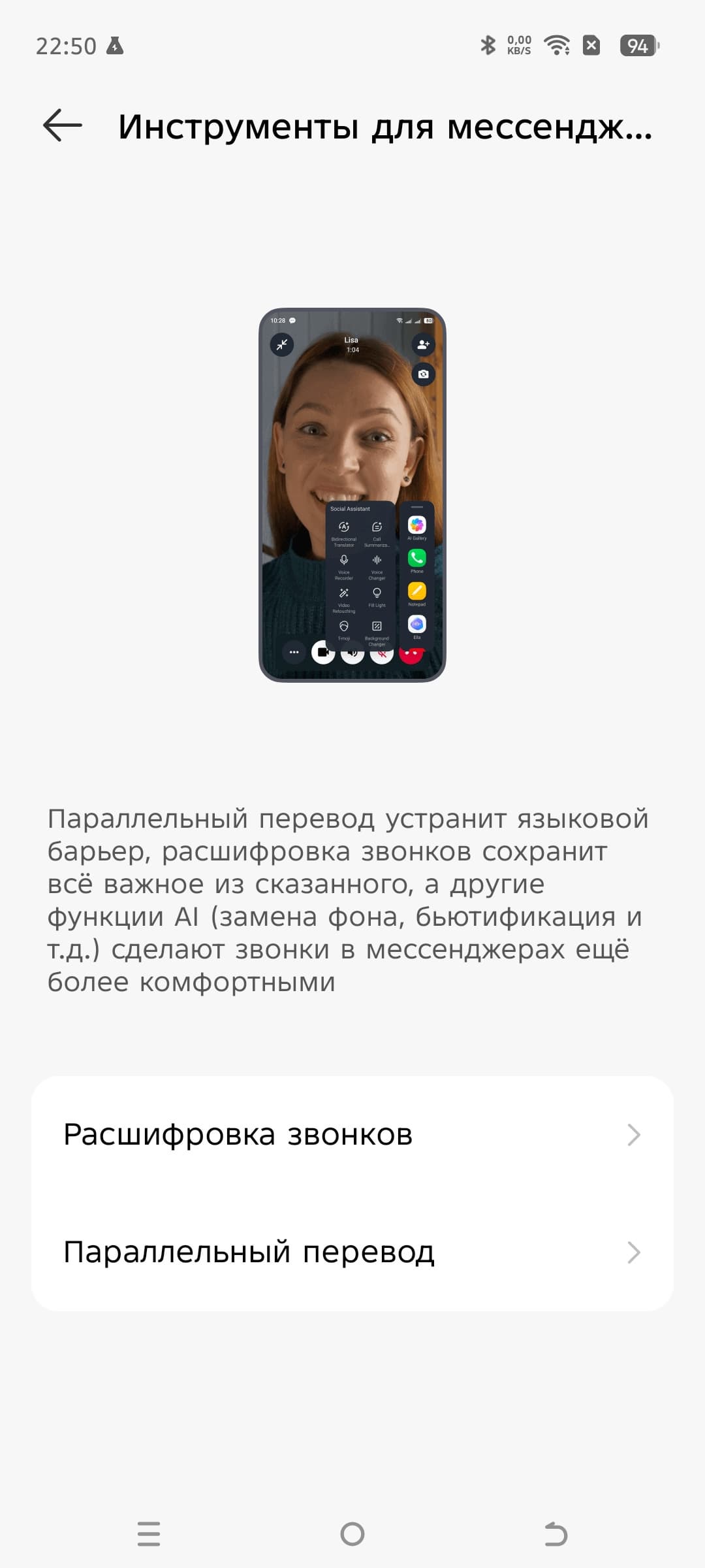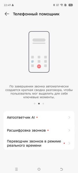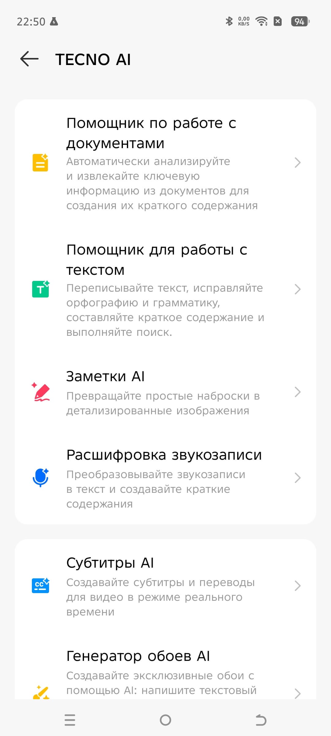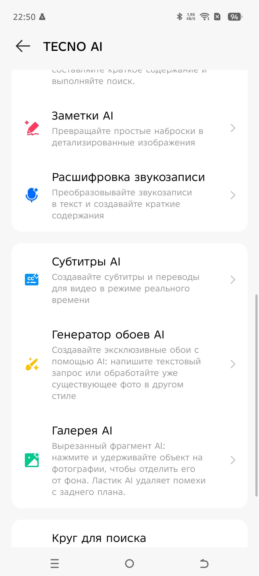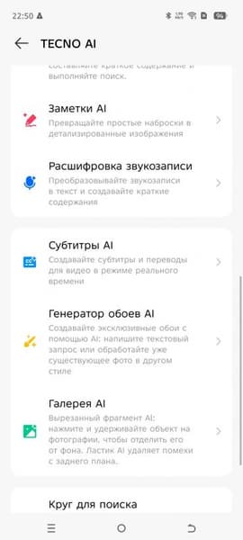 Интерфейс получил поддержку искусственного интеллекта Tecno AI с умным голосовым помощником Ella, который вызывается по умолчанию удерживанием кнопки питания. Tecno AI — искусственный интеллект на базе языковой модели собственной разработки. Благодаря ему в интерфейсе можно найти максимально широкий набор улучшающих жизнь ИИ-функций, часть из которых можно запустить в некоторых нативных приложениях, а еще часть — через умного ассистента Ella. Здесь есть практически всё, на что способен искусственный интеллект на данный момент, от базовых функций до улучшения фотографий и генерации субтитров для видео. Также с помощью Ella можно управлять сервисами Яндекс Go (такси и самокаты), Яндекс Карты и Яндекс Навигация, Яндекс Еда.