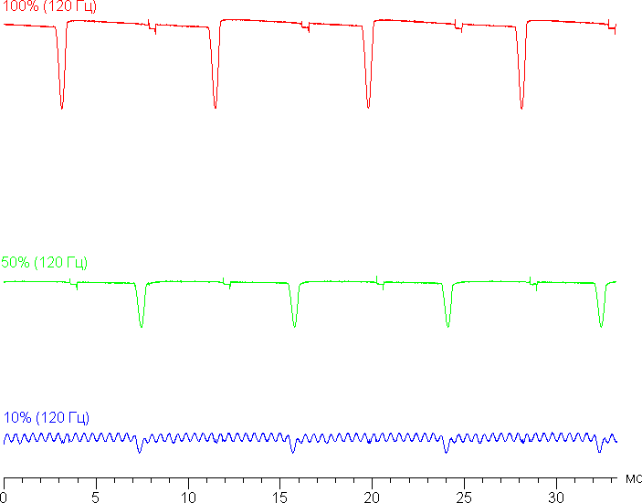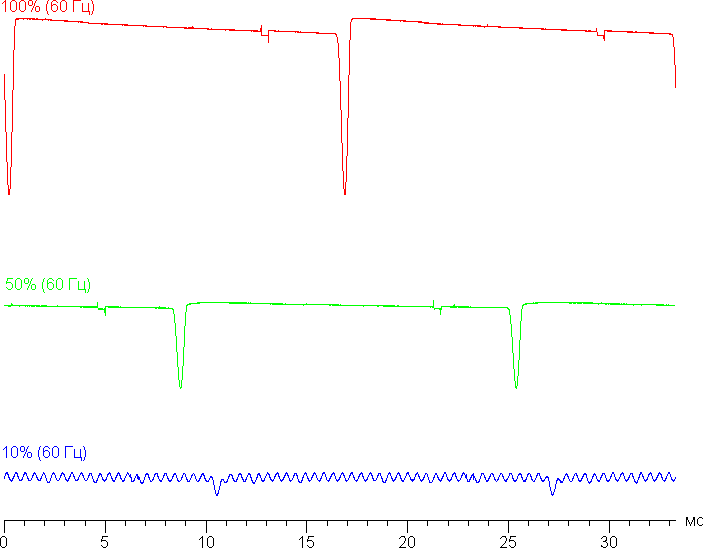 На любом уровне яркости присутствует значимая модуляция с частотой, равной текущей частоте обновления. На рисунках ниже приведены зависимости яркости (вертикальная ось) от времени (горизонтальная ось) для нескольких значений настройки яркости. Сначала для режима с частотой обновления 60 Гц:
