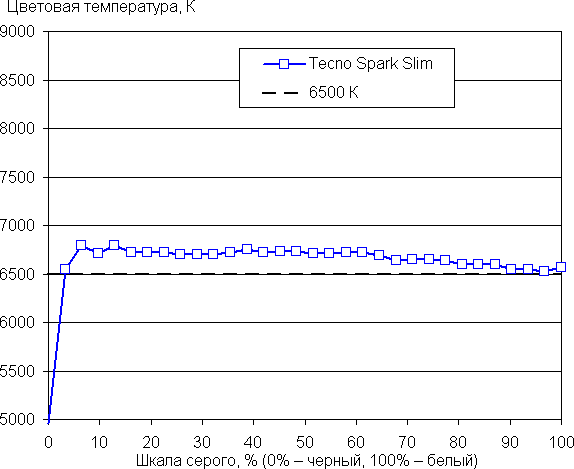 Напомним, что в случае OLED-экранов яркость фрагментов изображения динамично меняется в соответствии с характером выводимого изображения — слегка уменьшается для светлых в целом изображений. В итоге полученная зависимость яркости от оттенка (гамма-кривая), скорее всего, немного не соответствует гамма-кривой статичного изображения, так как измерения проводились при последовательном выводе оттенков серого почти на весь экран.