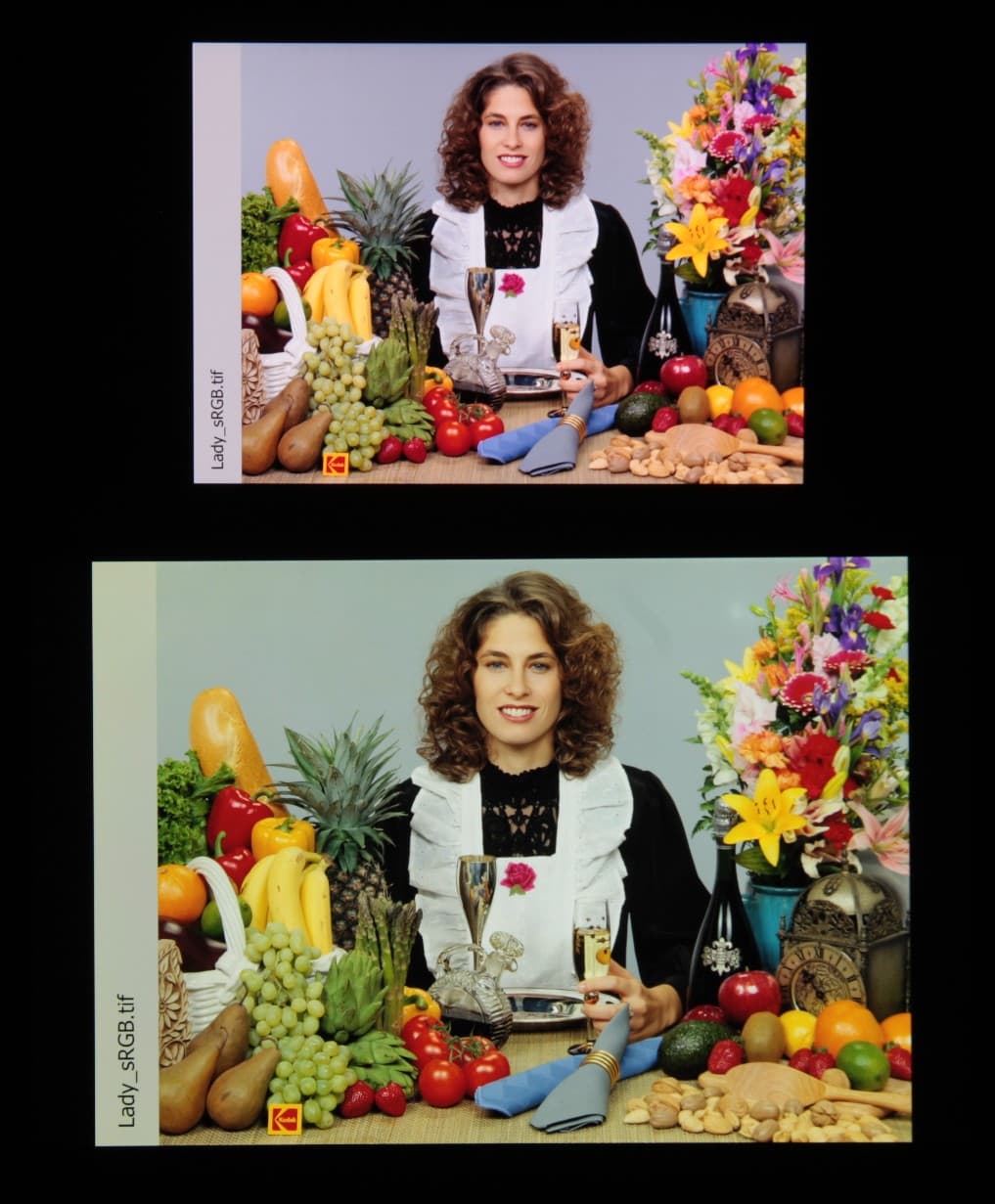 Соответственно, цветовой охват в случае изображения с профилем sRGB при выбранном профиле Яркие цвета и при выводе в ПО Галерея AI немного шире sRGB: