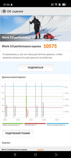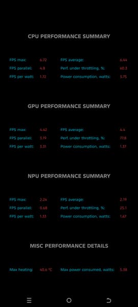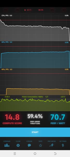 Тест на снижение производительности при нагреве мы проводим с помощью программы Burnout Benchmark, которая позволяет нагружать CPU, GPU и NPU. Уровень тротлинга сравнительно невысок.