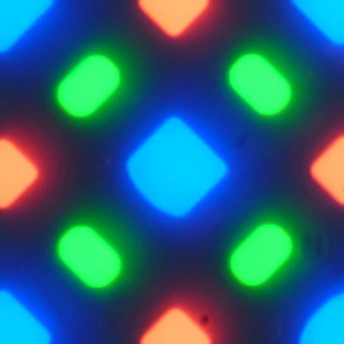 В этом экране используется матрица AMOLED — активная матрица на органических светодиодах. Полноцветное изображение создается с помощью субпикселей трех цветов — красного (R), зеленого (G) и синего (B), но красных и синих субпикселей в два раза меньше, что можно обозначить как RGBG. Это подтверждается фрагментом микрофотографии: