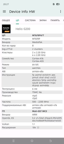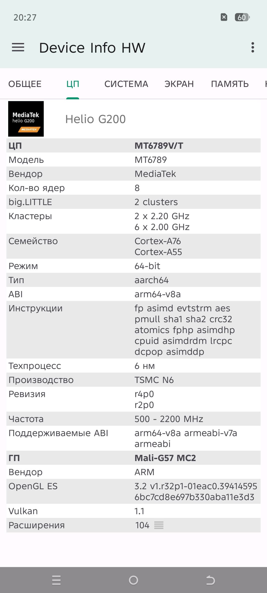 - SoC Mediatek Helio G200, 8 процессорных ядер (2×Cortex-A76 @2,2 ГГц + 6×Cortex-A55 @2,0 ГГц)
