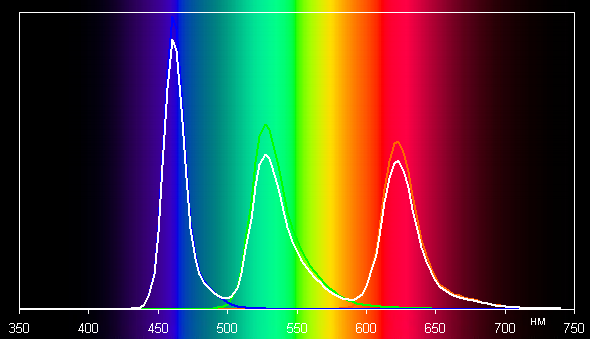В первом случае спектры компонент (то есть спектры чистых красного, зеленого и синего цветов) очень хорошо разделены: