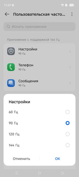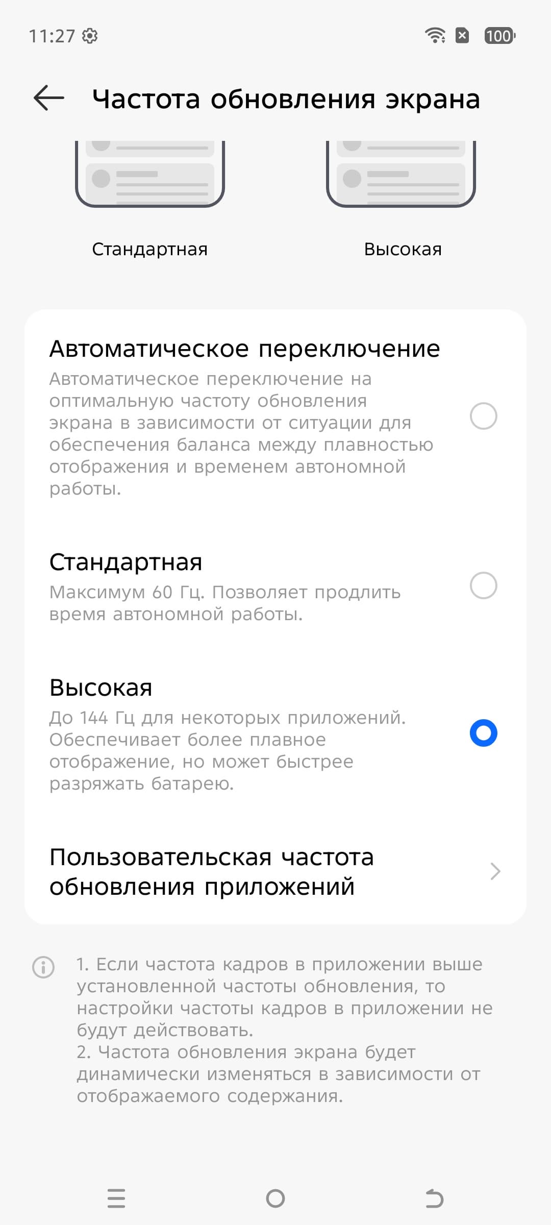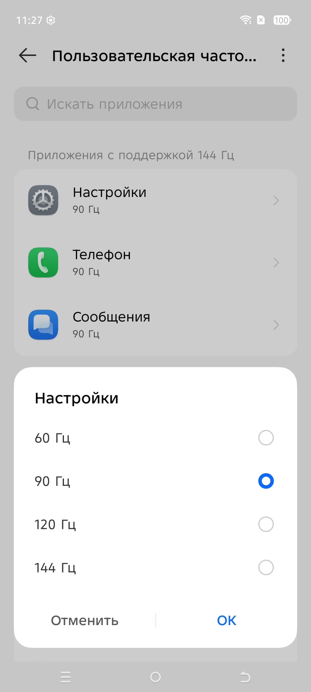 В настройках экрана можно включить режим с повышенной до 144 Гц частотой обновления. По факту частота обновления повышается максимум до 120 Гц почти во всех установленных приложениях, за исключением штатного приложения Настройки и еще двух приложений: