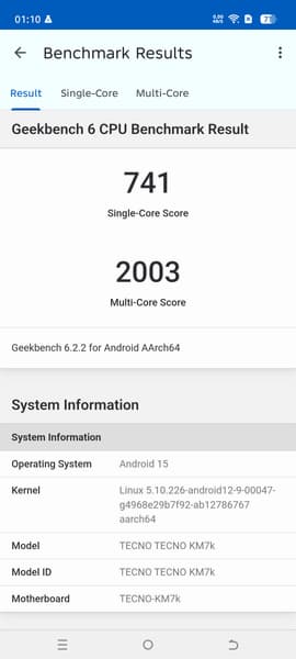 SoC изготовляется по 6-нанометровому техпроцессу. Это платформа бюджетного уровня, она набирает в тесте AnTuTu 11 всего 600 тысяч баллов, в то время как флагманы уже подобрались к отметке 4 млн. С требовательными играми смартфон не справляется, снимать видео в 4К не может, но сопроцессор Tecno T1 помогает чипу осилить максимальное разрешение съемки 2.5K (сама SoC справляется лишь с разрешением 1080×2520).