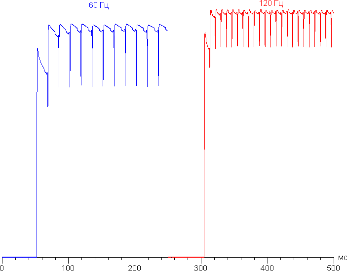 Переключение состояния элементов матрицы выполняется практически мгновенно, но на фронте включения может присутствовать ступенька, ширина которой зависит от текущей частоты обновления. Для частоты обновления в 60 Гц это примерно 17 мс, для 120 Гц — примерно 8 мс. Например, так выглядит зависимость яркости (вертикальная ось) от времени (горизонтальная ось) при переходе от черного к белому (режим 60 Гц и 120 Гц):
