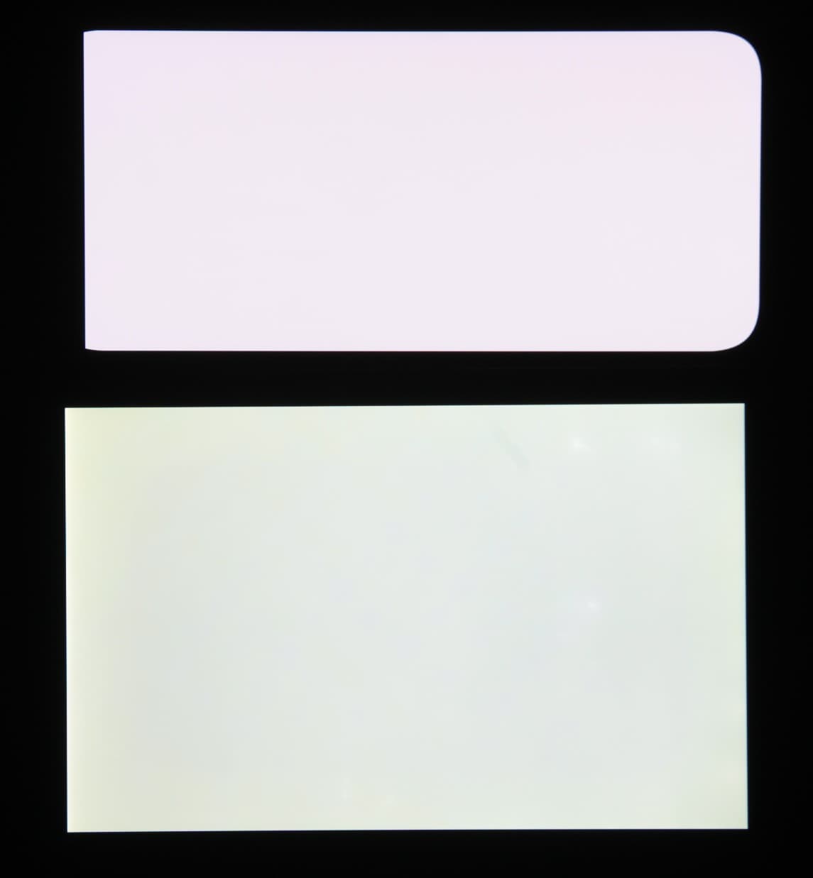 Экран характеризуется великолепными углами обзора. Яркость под углом у двух экранов (если сравнивать еще и с Nexus 7) уменьшается, но в случае смартфона падение яркости выражено гораздо меньше. В итоге, даже если установить формально одинаковую яркость, экран этого смартфона визуально выглядит гораздо более ярким (в сравнении с ЖК-экранами), так как на экран мобильного устройства часто приходится смотреть как минимум под небольшим углом. Правда, белый цвет при отклонении на большие углы приобретает легкий синеватый оттенок. Черный цвет у смартфона остается просто черным под любыми углами. Он настолько черный, что параметр контрастности в данном случае неприменим. Для сравнения приведем фотографии, на которых на экран смартфона и экран второго участника (Nexus 7; снизу — Nexus 7, сверху — смартфон) выведены одинаковые изображения, при этом яркость экранов изначально установлена примерно на 200 кд/м², а цветовой баланс на фотоаппарате принудительно переключен на 6500 К.