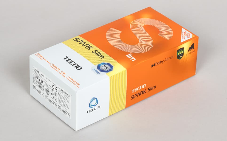 Смартфон Tecno Spark Slim поставляется в картонной упаковке стандартной формы с недорогим оформлением.