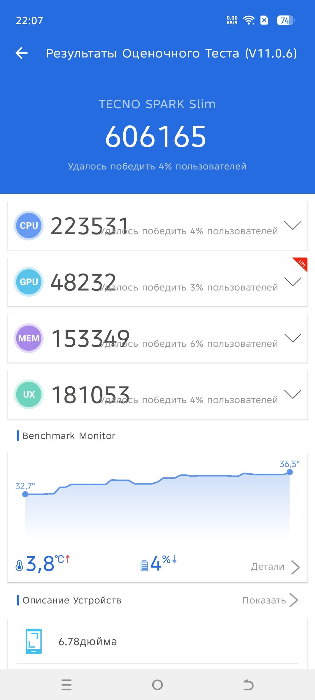 Tecno Spark Slim — это один из самых необычных смартфонов, появившихся на мобильном рынке в конце ушедшего года. Правда, это не флагман, и даже не субфлагман, а доступный аппарат, весь подчиненный идее создать очень тонкий корпус, который будет шикарно выглядеть со стороны. И при рекомендованной цене всего в 23 тысячи рублей (а сейчас со скидками — от 18 тысяч) он предлагает необычный дизайн, отличный качественный экран (пусть и с неудобными немного загнутыми краями), хороший звук. Качество фото- и видеосъемки средненькое, производительность терпимая, автономность нормальная. Очевидно, что покупать этот смартфон будут именно за внешний вид и ощущение тонкого корпуса в руке (и в кармане), а не за что-то другое.