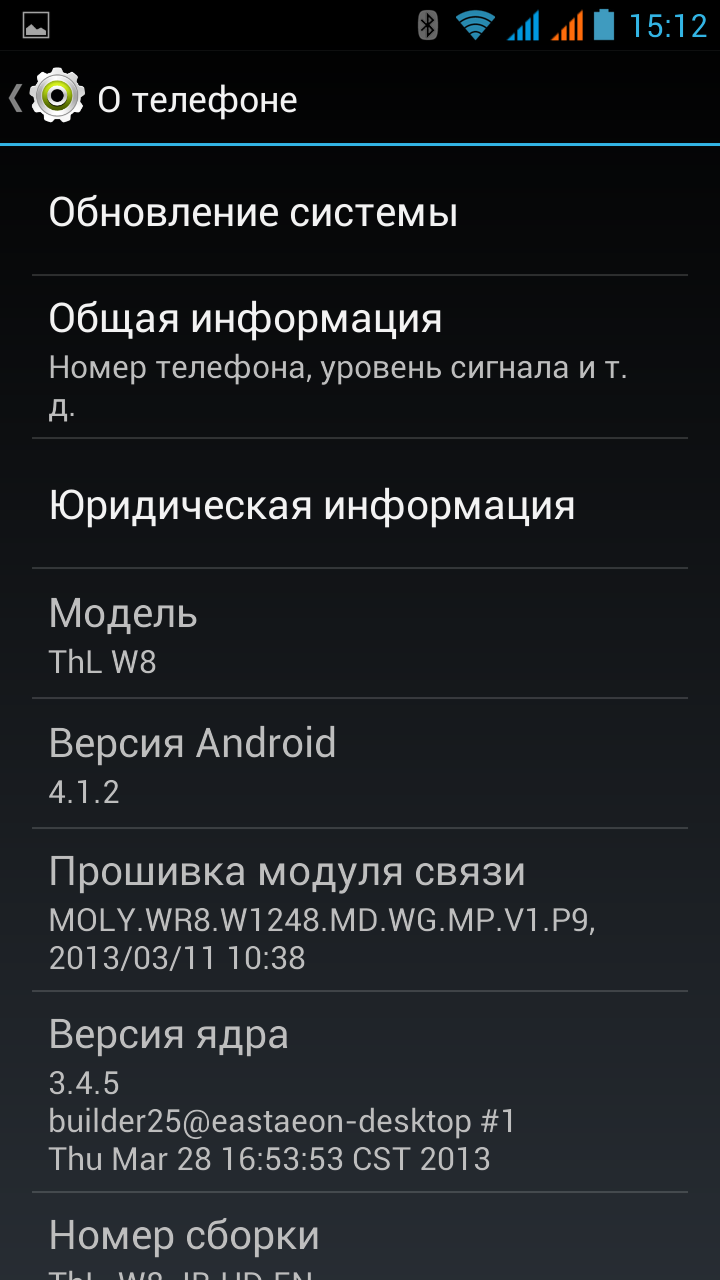 Смартфон ThL W8 работает под управлением операционной системы Android 4.1.2. На момент написания обзора какое-либо онлайн-обновление прошивки отсутствовало.