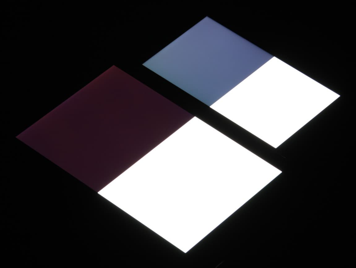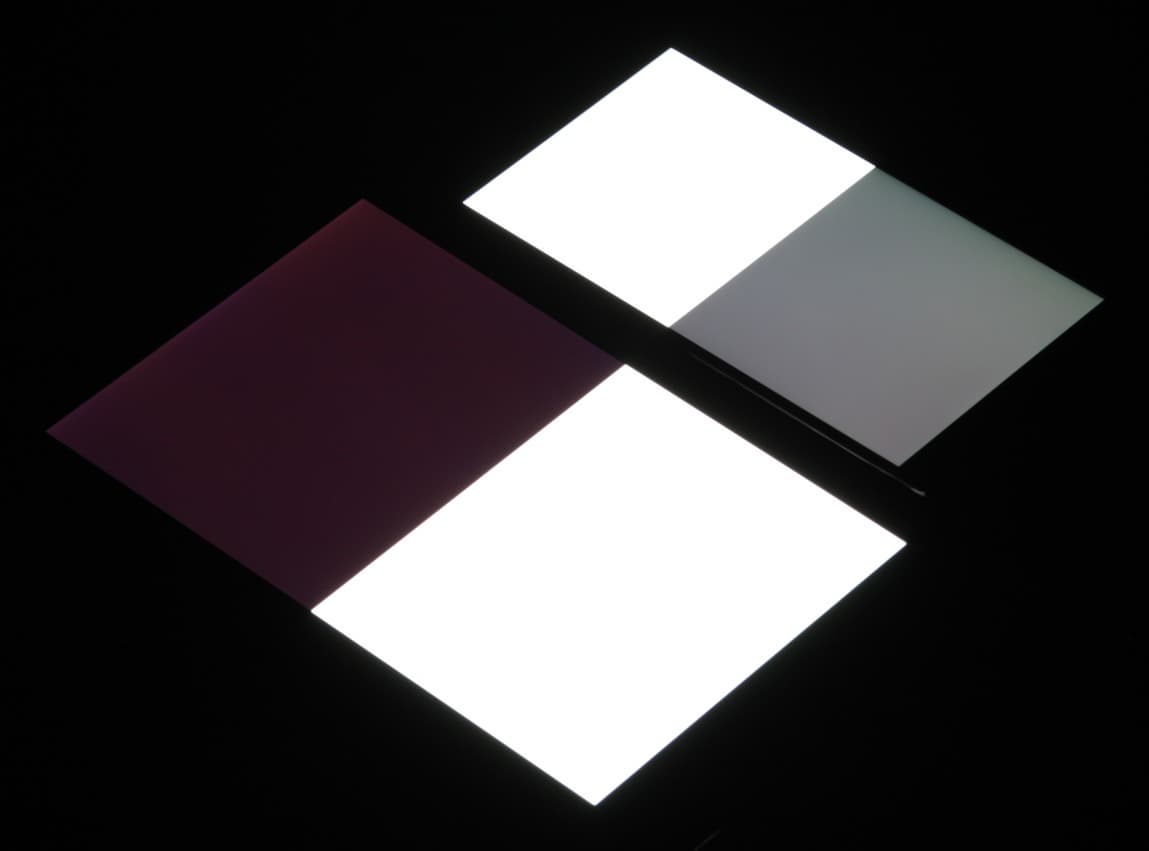 Яркость под углом у экранов уменьшилась (как минимум в 5 раз, исходя из разницы в выдержке), но в случае TP-Link Neffos C5 Max падение яркости больше. Черное поле при отклонении по диагонали высветляется сильно и приобретает фиолетовый оттенок или остается условно нейтрально-серым. Фотографии ниже это демонстрируют (яркость белых участков в перпендикулярном плоскости экранов направлении одинаковая!):