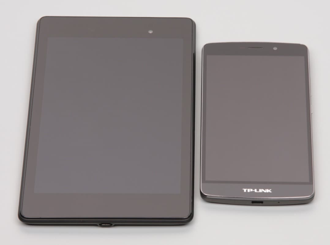 Лицевая поверхность экрана выполнена в виде стеклянной пластины с зеркально-гладкой поверхностью, устойчивой к появлению царапин. Судя по отражению объектов антибликовые свойства экрана чуть хуже, чем у экрана Google Nexus 7 (2013) (далее просто Nexus 7). Для наглядности приведем фотографию, на которой в выключенных экранах отражается белая поверхность (слева — Nexus 7, справа — TP-Link Neffos C5 Max, далее их можно различать по размеру):