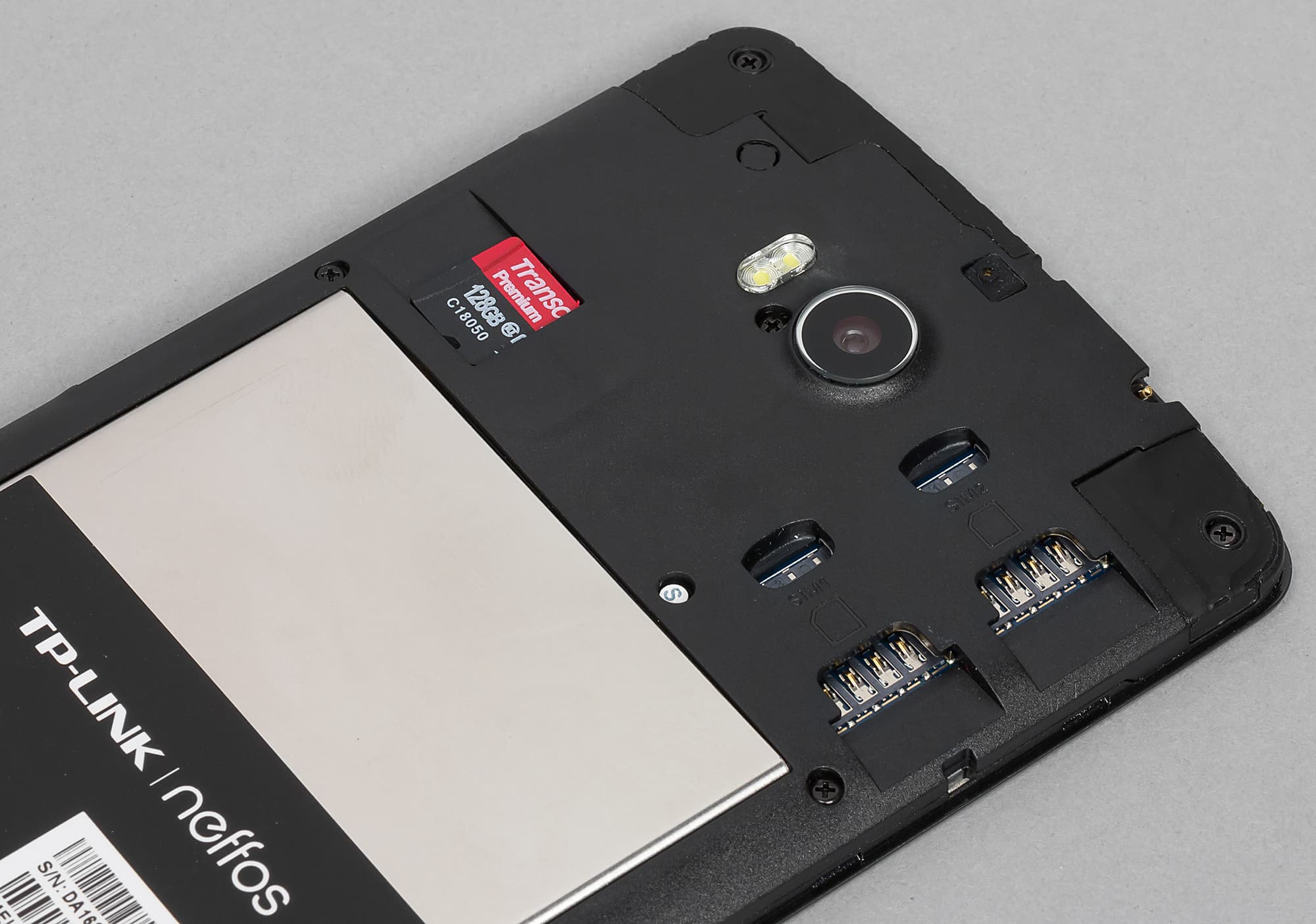 Крышку легко можно снять, поддев ногтем за специальную выемку. Под ней скрывается два отдельных разъема для карт формата Micro-SIM и один разъем для карты памяти microSD. Официально поддерживаются карточки до 32 ГБ, но на практике наша проверочная карта объемом 128 ГБ была распознана устройством. Поддерживается горячая замена SIM-карт. А вот батарея, несмотря на ее доступность (вследствие съемной крышки), оказалась не сменной, она накрепко закреплена в своем гнезде с помощью металлической скобы.