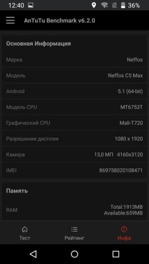 Аппаратная платформа TP-Link Neffos C5 Max строится на базе восьмиядерной однокристальной системы (SoC) MediaTek MT6753. В конфигурацию SoC входят восемь процессорных ядер Cortex-A53, работающих на частоте до 1,3 ГГц. За обработку графики отвечает видеоускоритель Mali-T720. Объем ОЗУ составляет 2 ГБ, из 16 ГБ внутреннего хранилища владельцу остается не более 10 ГБ. Есть возможность установки карт памяти microSD, и для этого не придется жертвовать ни одной из SIM-карт. На практике наша проверочная карта Transcend Premium microSDXC UHS-1 объемом 128 ГБ была успешно распознана устройством.