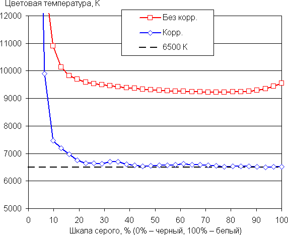 В итоге цвета имеют естественную насыщенность. Баланс оттенков на шкале серого средний, так как цветовая температура существенно выше стандартных 6500 К, но отклонение от спектра абсолютно черного тела (ΔE) ниже 10, что для потребительского устройства считается приемлемым показателем. При этом цветовая температура и ΔE мало изменяются от оттенка к оттенку — это положительно сказывается на визуальной оценке цветового баланса. (Самые темные области шкалы серого можно не учитывать, так как там баланс цветов не имеет большого значения, да и погрешность измерений цветовых характеристик на низкой яркости большая.)
