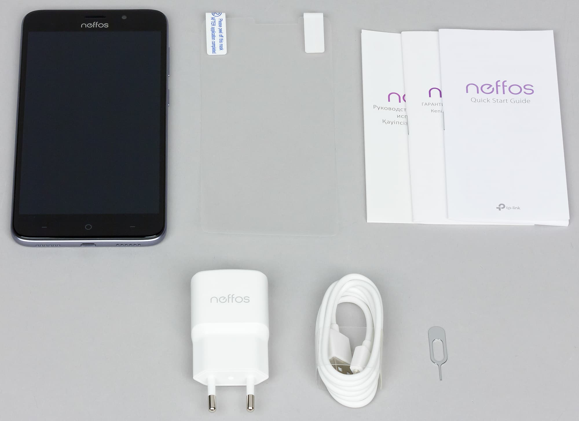 Комплект Neffos C7 состоит из стандартного сетевого адаптера, USB-кабеля, ключика для извлечения карт, а также защитной пленки на экран.