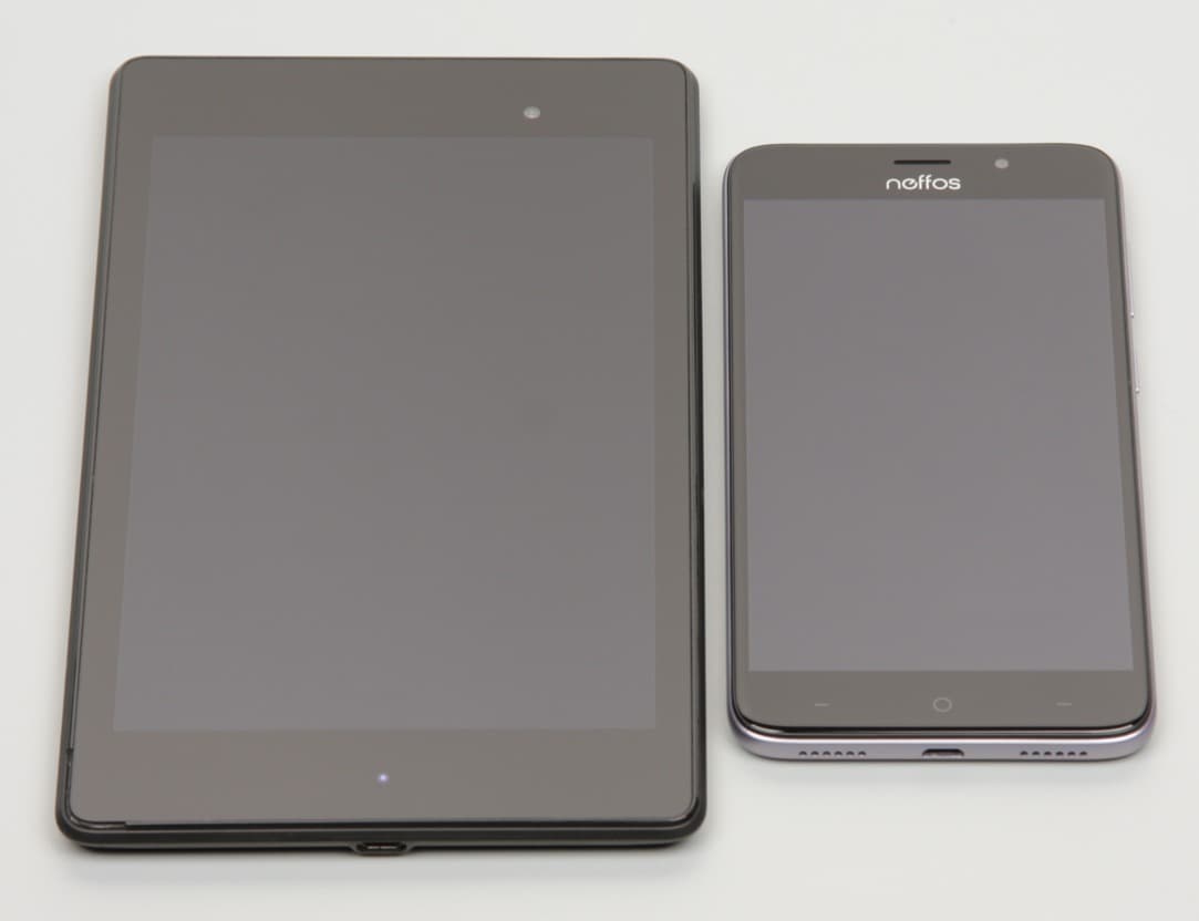 Лицевая поверхность экрана выполнена в виде стеклянной пластины с зеркально-гладкой поверхностью, устойчивой к появлению царапин. Судя по отражению объектов, антибликовые свойства экрана чуть хуже, чем у экрана Google Nexus 7 (2013) (далее просто Nexus 7). Для наглядности приведем фотографию, на которой в выключенных экранах отражается белая поверхность (слева — Nexus 7, справа — TP-Link Neffos C7, далее их можно различать по размеру):