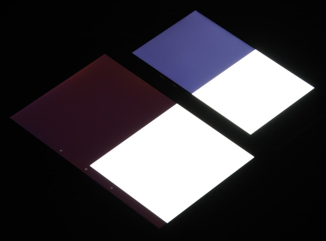 Экран имеет хорошие углы обзора без значительного сдвига цветов даже при больших отклонениях взгляда от перпендикуляра к экрану и без инвертирования (кроме самых-самых темных при отклонении взгляда по одной диагонали) оттенков. Для сравнения приведем фотографии, на которых на экраны Ulefone Be Touch и Nexus 7 выведены одинаковые изображения, при этом яркость экранов изначально установлена примерно на 200 кд/м², а цветовой баланс на фотоаппарате принудительно переключен на 6500 К. Перпендикулярно к экранам белое поле: