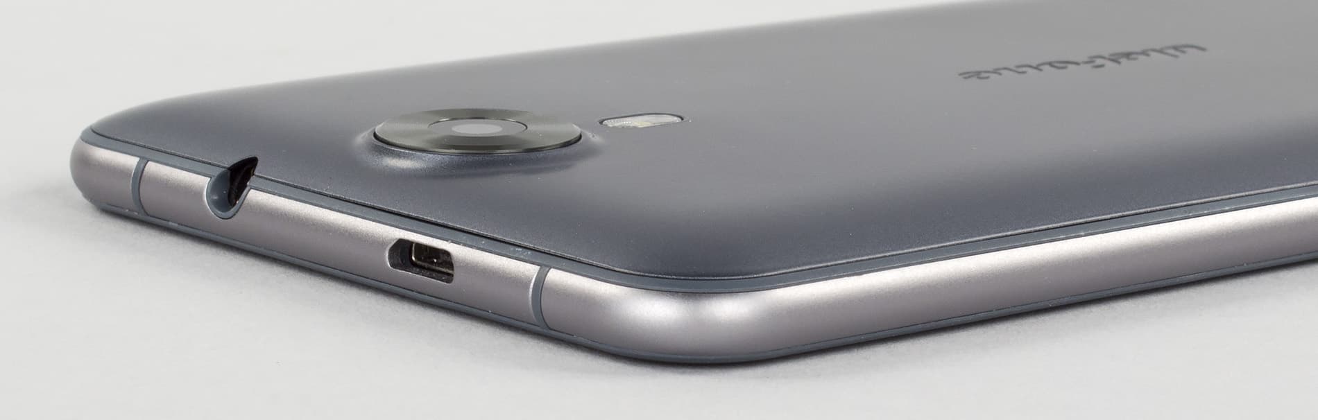 Универсальный разъем Micro-USB размещен на верхнем торце, аудиовыход для наушников 3,5 мм врезан сюда же. Расположены они не слишком близко друг к другу, и вряд ли пользователь ощутит какие-либо неудобства при одновременном подключении обоих штекеров. В качестве приятного бонуса разъем Micro-USB здесь еще и поддерживает режим подключения внешних устройств (USB OTG), так что через соответствующий переходник можно подключить флэш-накопитель и считывать информацию прямо с него. Никаких заглушек на своих разъемах смартфон не имеет, так как не оборудован защитой от воды и грязи. Крепления для ремешка также нет.