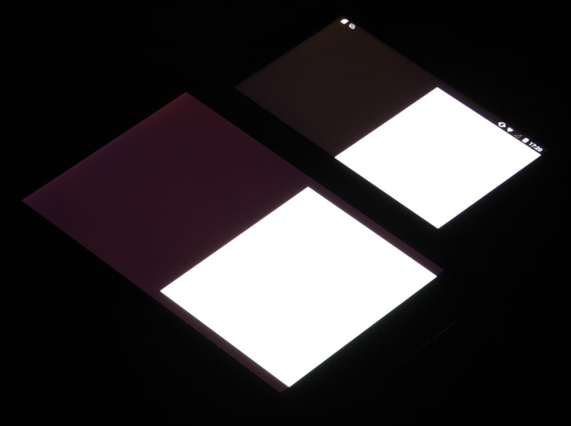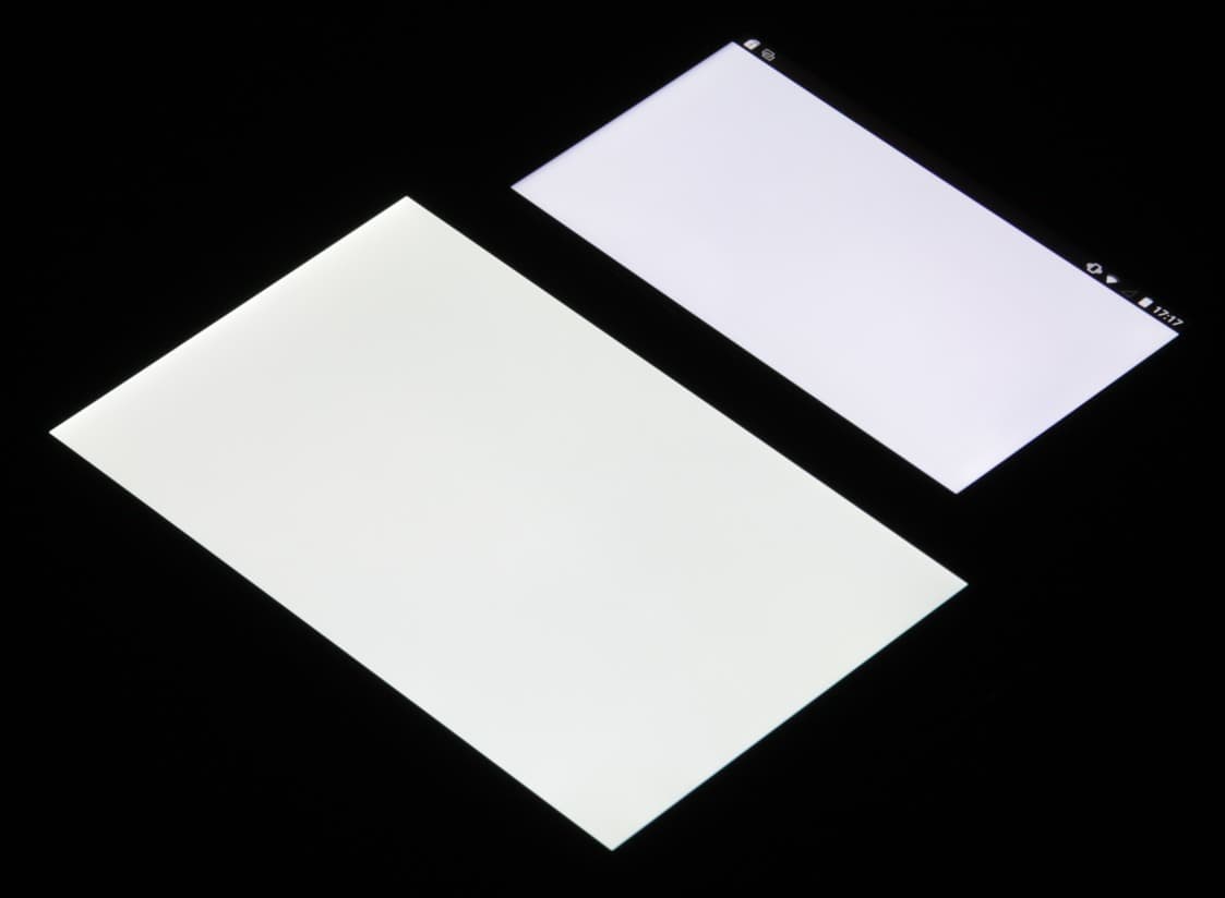 Экран имеет хорошие углы обзора без значительного сдвига цветов даже при больших отклонениях взгляда от перпендикуляра к экрану и без инвертирования оттенков. Для сравнения приведем фотографии, на которых на экраны Ulefone Be Touch 2 и Nexus 7 выведены одинаковые изображения, при этом яркость экранов изначально установлена примерно на 200 кд/м², а цветовой баланс на фотоаппарате принудительно переключен на 6500 К. Отметим, что с яркостью экрана у этого аппарата творится что-то странное, так как, например, в штатной Галерее яркость вообще не зависит от положения ползунка настройки яркости, а в других программах яркость после смены изображения может «уползать» в сторону повышения или понижения. Поэтому для тестирования нам пришлось использовать вывод изображений в браузере Chrome и дожидаться стабильной яркости. Перпендикулярно к экранам белое поле: