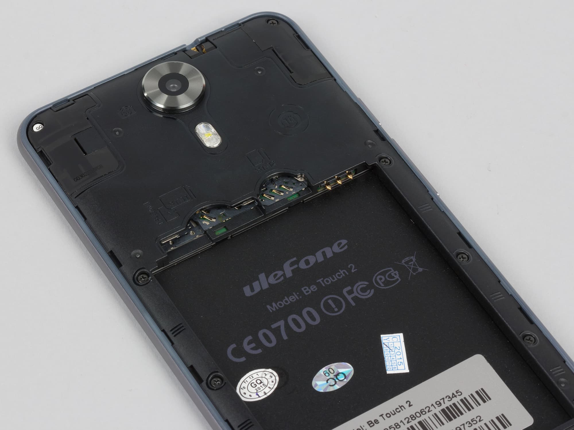 Под крышкой скрывается набор из двух неравнозначных разъемов для SIM-карт (одной Micro-SIM и одной Mini-SIM), а также слот для карты памяти microSD. Батарея здесь съемная, она подпирает собой снизу все карты, так что горячая их замена в любом случае невозможна.