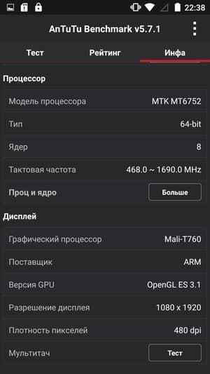 - SoC MediaTek MT6752, 1,7 ГГц, 8 ядер, ARM Cortex-A53